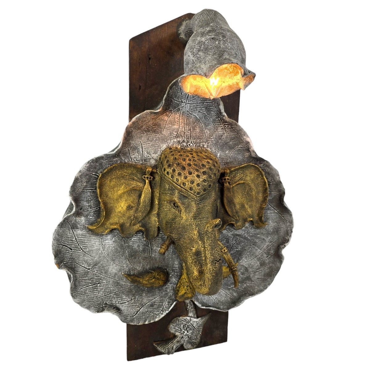 Das Herzstück der Lampe bildet die kunstvoll gestaltete Ganesha-Figur, die liebevoll mit filigranen Blumenmotiven verziert ist. Edle goldfarbene Akzente setzen die feinen Details der Skulptur gekonnt in Szene und verleihen ihr eine luxuriöse Ausstrahlung.